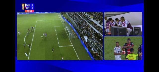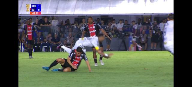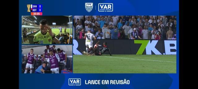 比赛进行到第32分钟,桑托斯11号前锋吉列尔梅左路传中,博塔福戈后卫禁区内手球。吉列尔梅传中,博塔福戈后卫先是用脚挡了一下。倒地后,皮球打到他手臂上。那个手球该不该判点球?直播的巴西电台解说员认为不该,因为皮球是在不可避免的情况下打到博塔福戈后卫的手臂上。但回看VAR后,主裁判还是给了桑托斯点球。主队9号前锋蒂基尼奥·苏亚雷斯主罚,将球打进对手大门右下死角,桑托斯1比1领先。