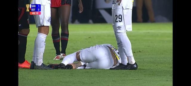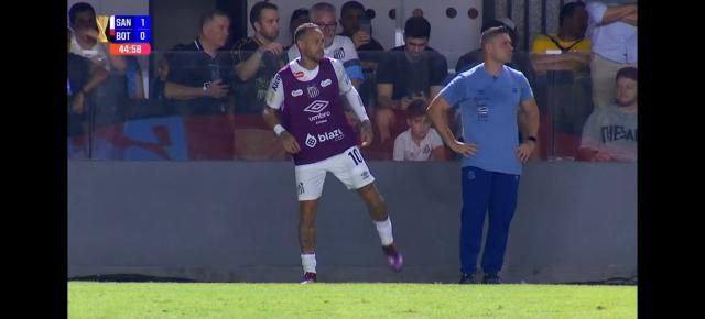 上场之后,内马尔从队友后腰迭戈·皮图卡那里接过队长袖标。刚刚上场30秒,第一次触球,内马尔就倒地。当时并不是他主动触球,而是对方5号中卫埃德松后场大脚解围,皮球踢到上前逼抢的内马尔隐私部位,结果他就倒地了。那一幕让人心里一紧,好在有惊无险。第49分钟,内马尔争抢时被对方3号中卫阿利松·卡西亚诺踢倒。内马尔第二次倒地,阿利松·卡西亚诺吃到黄牌。随后,内马尔主罚任意球,但皮球打在人墙上弹出底线。内马尔接着主罚角球,吉列尔梅禁区内射门,皮球打在横梁上弹出。第51分钟,博塔福戈后腰加布里埃尔·比斯波争抢时踢到内马尔脚踝,桑托斯10号再度倒地,加布里埃尔·比斯波则吃到黄牌。上场仅仅6分钟,内马尔就让对手吃到两张黄牌。