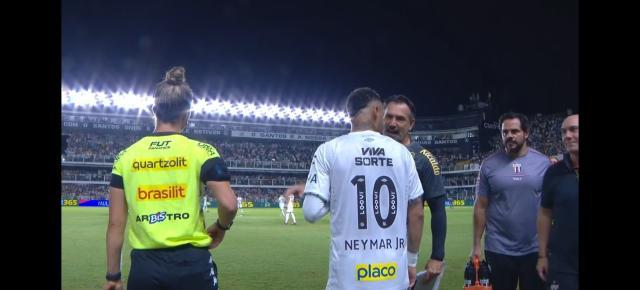 上半场伤停补时5分钟,常规45分钟结束时,内马尔离开替补席,站到场边,让人觉得他当时就有可能被桑托斯主教练佩德罗·凯希尼亚派上场。但最后,现场球迷只是空欢喜一场。上半场开始前,两队主力还没从更衣室出来,内马尔就站到了场边准备上场。上半场开始,内马尔迎来重返桑托斯后的首秀。之前,内马尔曾说过,以他目前的身体状态,他最多能踢30分钟球。但考虑到球迷的热切期望,桑托斯教练组决定让他踢45分钟。